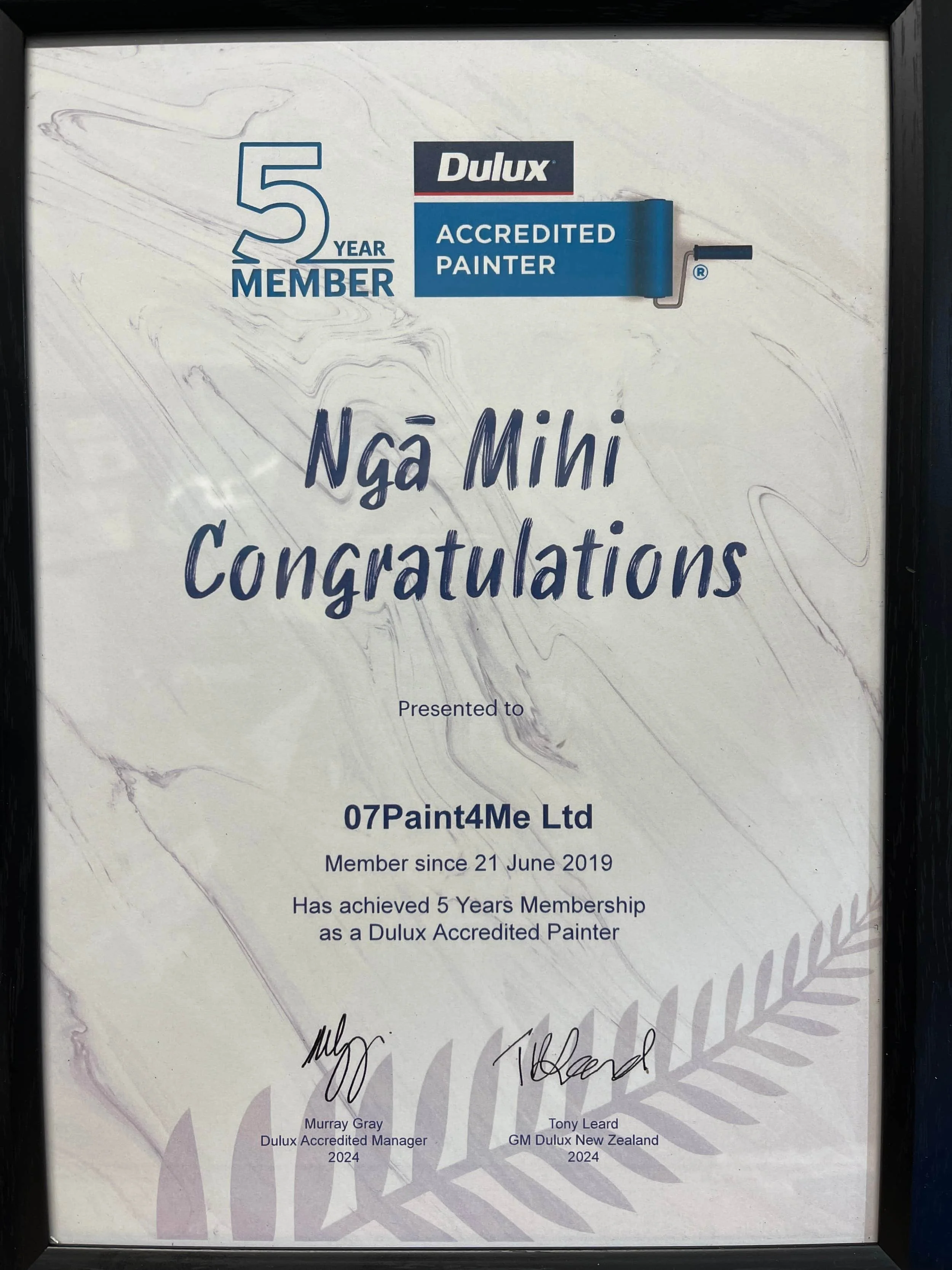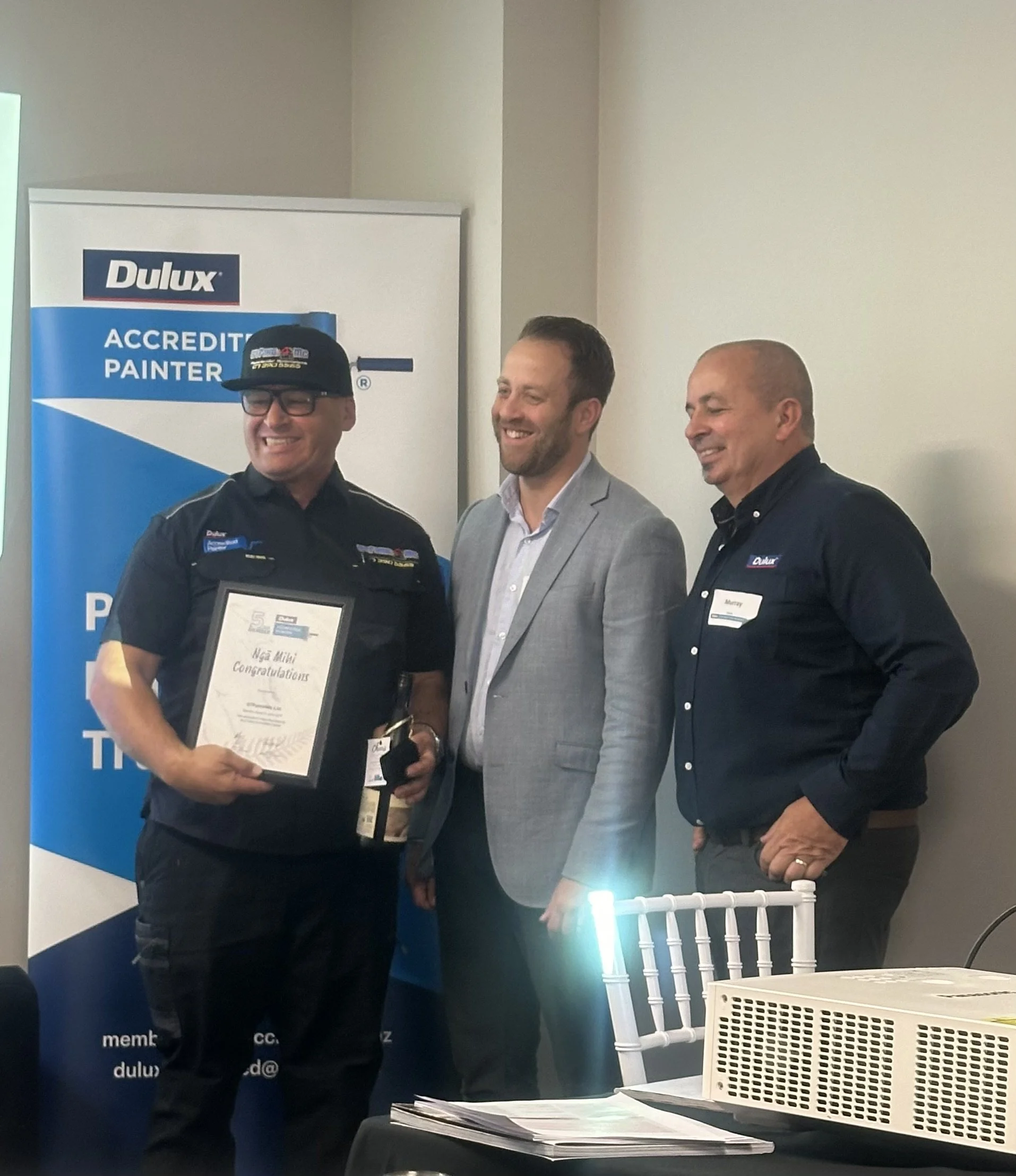 Patrick McNicholl receiving recognition of our 5 year membership as a Dulux Accredited Painter from Dulux Accredited Manager Murray Gray.